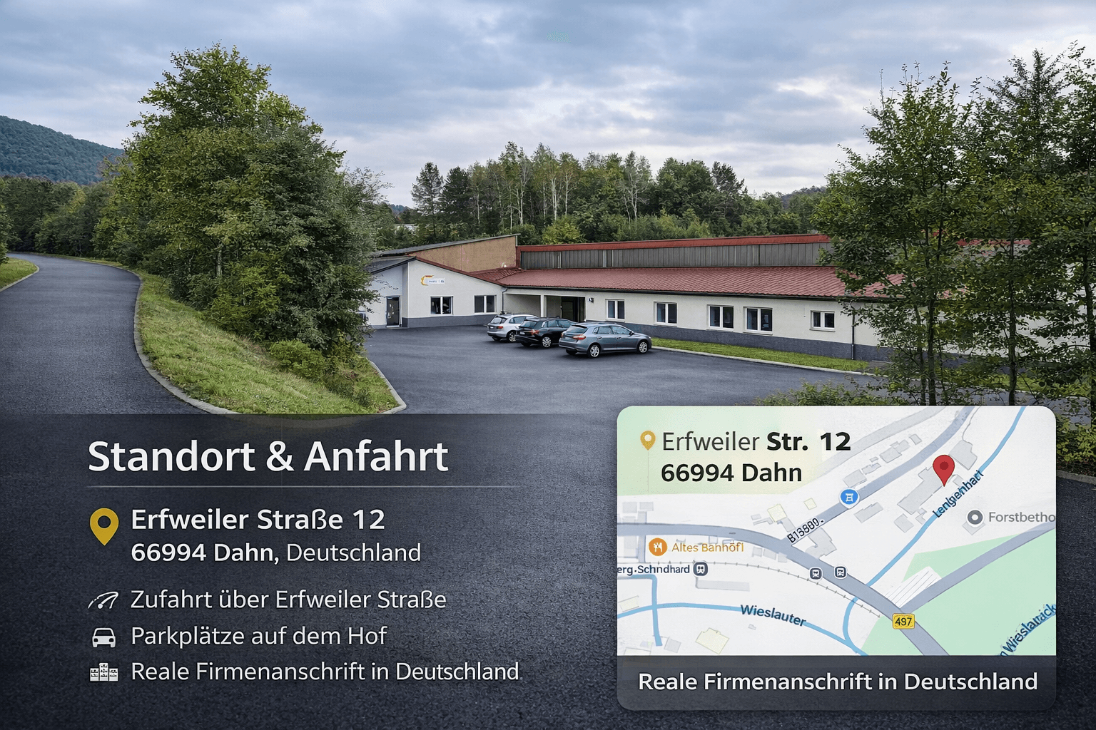 Unsere Geschäftsadressen befinden sich in Dahn, Rheinland-Pfalz – nutzbar für Kunden weltweit.